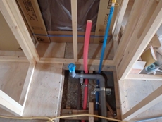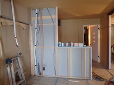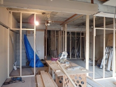 | 下地造作の施工写真です。 | 配管設置の様子です。 | キッチンの設置をしています。後ろ側からで失礼します>< |