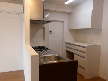 | 施工完了。天井・壁の一部を除いて、大幅な間取り変更を行いました。家族みなの顔が見えるようにと、キッチンも対面式にしました。 | 各室建具とキッチンの面材を同色にしてお施主様のご希望でドアだけは白、加えて、キッチン本体と背面収納のメーカーが違いますので、背面収納は自己主張しない白を選択しました。 |