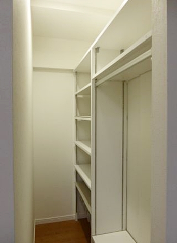 | 中でも1番は、廊下に洗面化粧台を設置したことでしょうか。廊下というのは、単に通行スペース。その部分を洗面と兼用することで、少しでも無駄を省きました。 | 玄関横のシューズクロークです。コートも掛けられますので、態々室内に持ち込む必要がありません。これだけの棚があれば、6名分賄えますし、将来お孫さんのベビーカーも奥に収納出来ます!S様この度はご依頼ありがとうございました! |