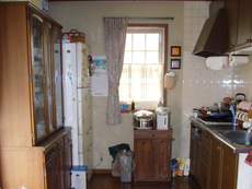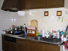 | 施工前の様子です。暗い印象のキッチンでした。 | タイル壁のオーソドックスなI型キッチンです。 |