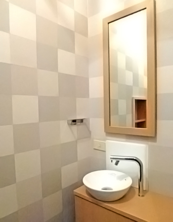 | 施工後の様子です。お客様のイメージに合うよう、市販されている商品は全て検討しました。お仕事をされているので、鍵をお預かりしての工事でした。 | 施工後の手洗いの様子です。おしゃれで手洗いしやすい空間に変化しました。 |