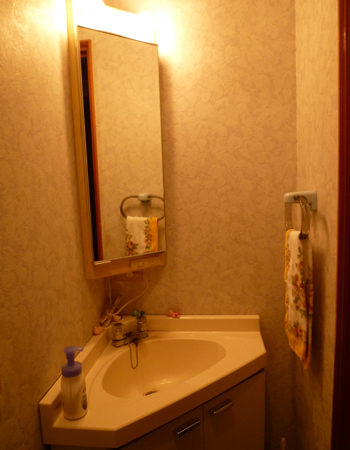 | 施工前の様子です。 | 施工前の手洗いの様子です。角に手洗いと鏡があるので、使い勝手が良くありませんでした。 |