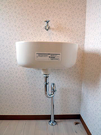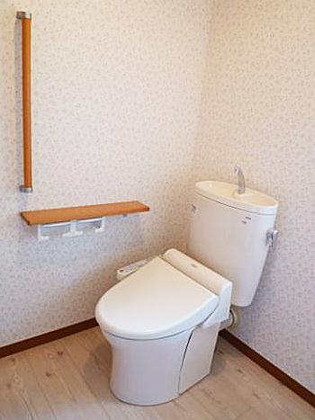 | 施工が完了しました。車椅子をご利用のため、隣の納戸を用いて空間を広げ、和から洋へ変更しました。これで転倒の心配はありません。 | トイレ内に手洗いを設置しました。 |