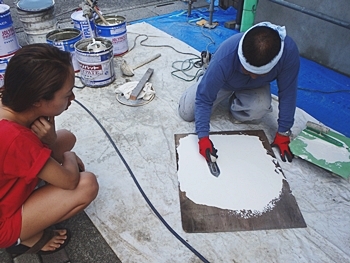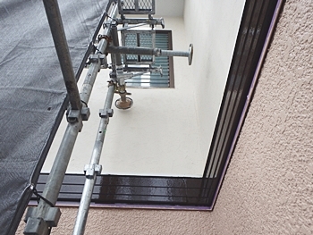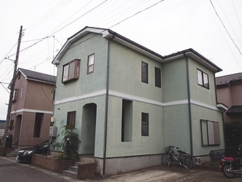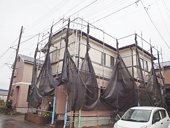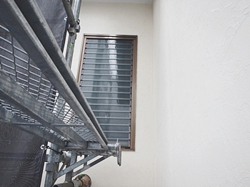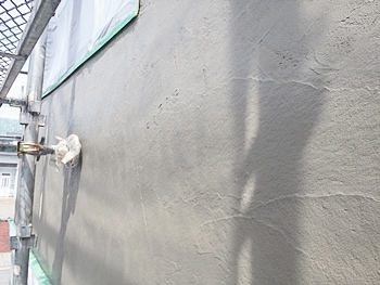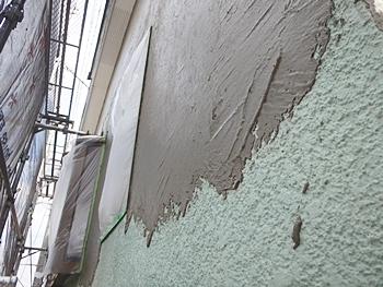 | 既存のモルタル塗りに対候性や機能性に優れるジョリパットを用いて塗り壁風に仕上げました。ジョリパットは、ひび割れしにくい塗材であり、防カビ、防藻性があるのでメンテナンスが簡単です。 施工期間中に強風予報がありましたので、気を使いました。 |